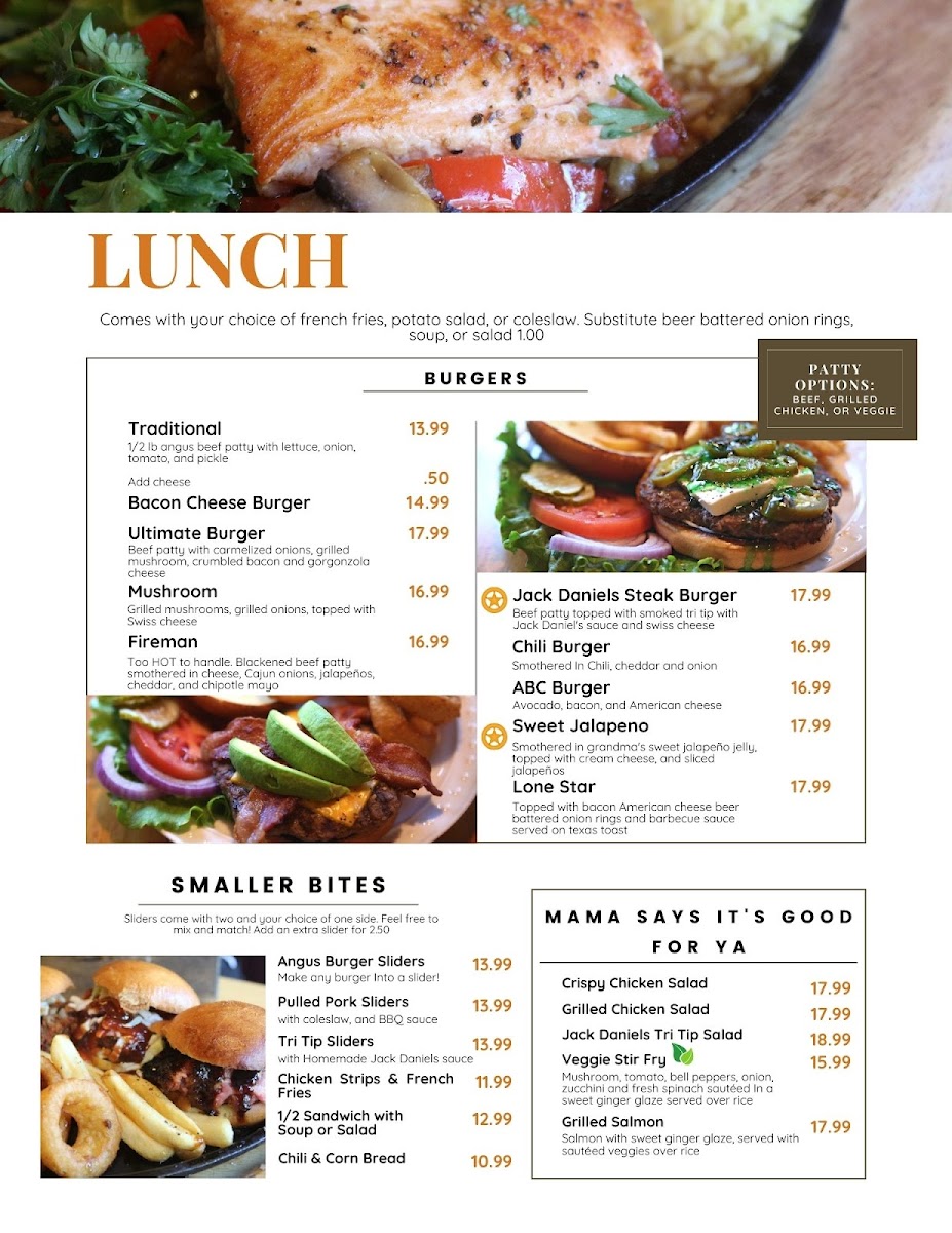 Patty Options:Angus beef patty, grilled chicken or veggie patty with lettuce, onion, tomato, and pickle. Choice of pepper jack, cheddar, jack, swiss, or american cheese. Comes with your choice of french fries, fruit, potato salad, or cottage cheese. Onion rings for a dollar more.