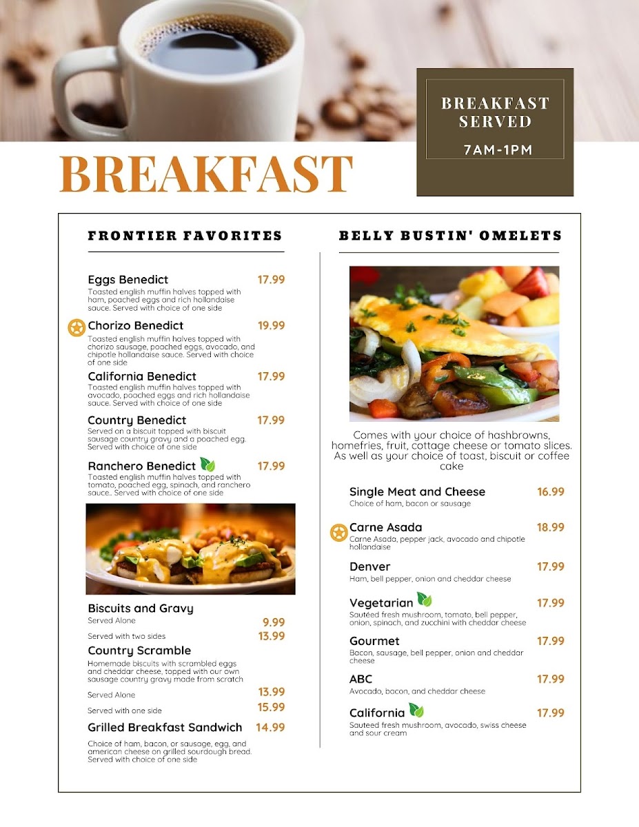 Bacon, sausage, bell pepper, onion, and cheddar cheese. Comes with your choice of hash browns, home fries, fruit, cottage cheese, tomato slices, or apple sauce. As well as toast, biscuit, or coffee cake.