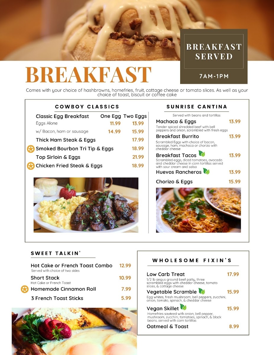 Choice of ham, bacon, or sausage. Comes with your choice of hash browns, home fries, fruit, cottage cheese, tomato slices. As well as toast, biscuit, or coffee cake.