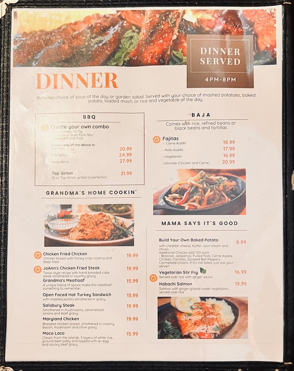 10 oz. Top Sirloin grilled to perfection.Comes with your choice of mashed potato, baked potato, fries, or loaded mashed potato. Includes vegetable, soup or salad, and fresh baked bread or cornbread.